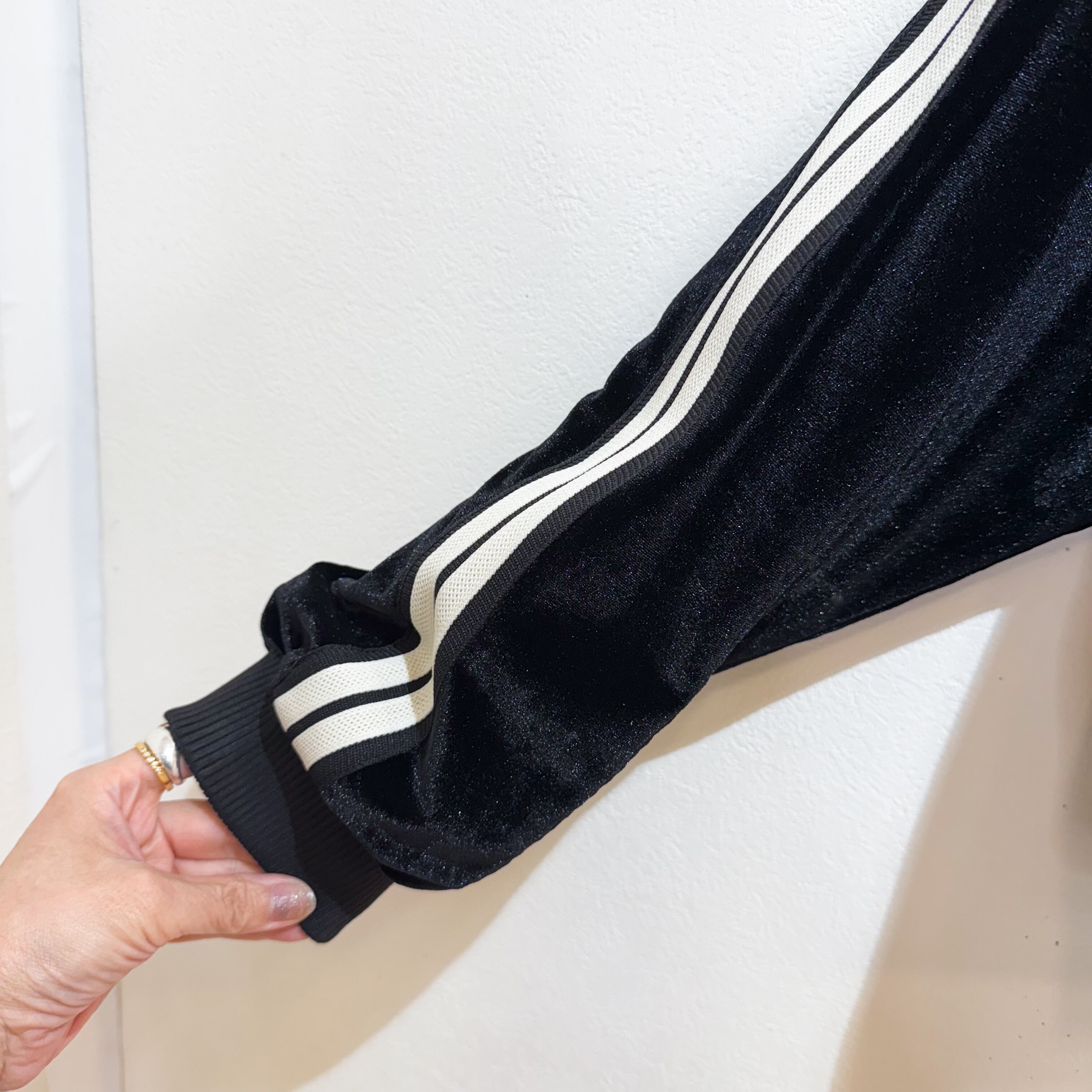 袖のラインがアクセントとなり、スポーティさとベロア素材のトレンド感を兼ね備えたブルゾンです。