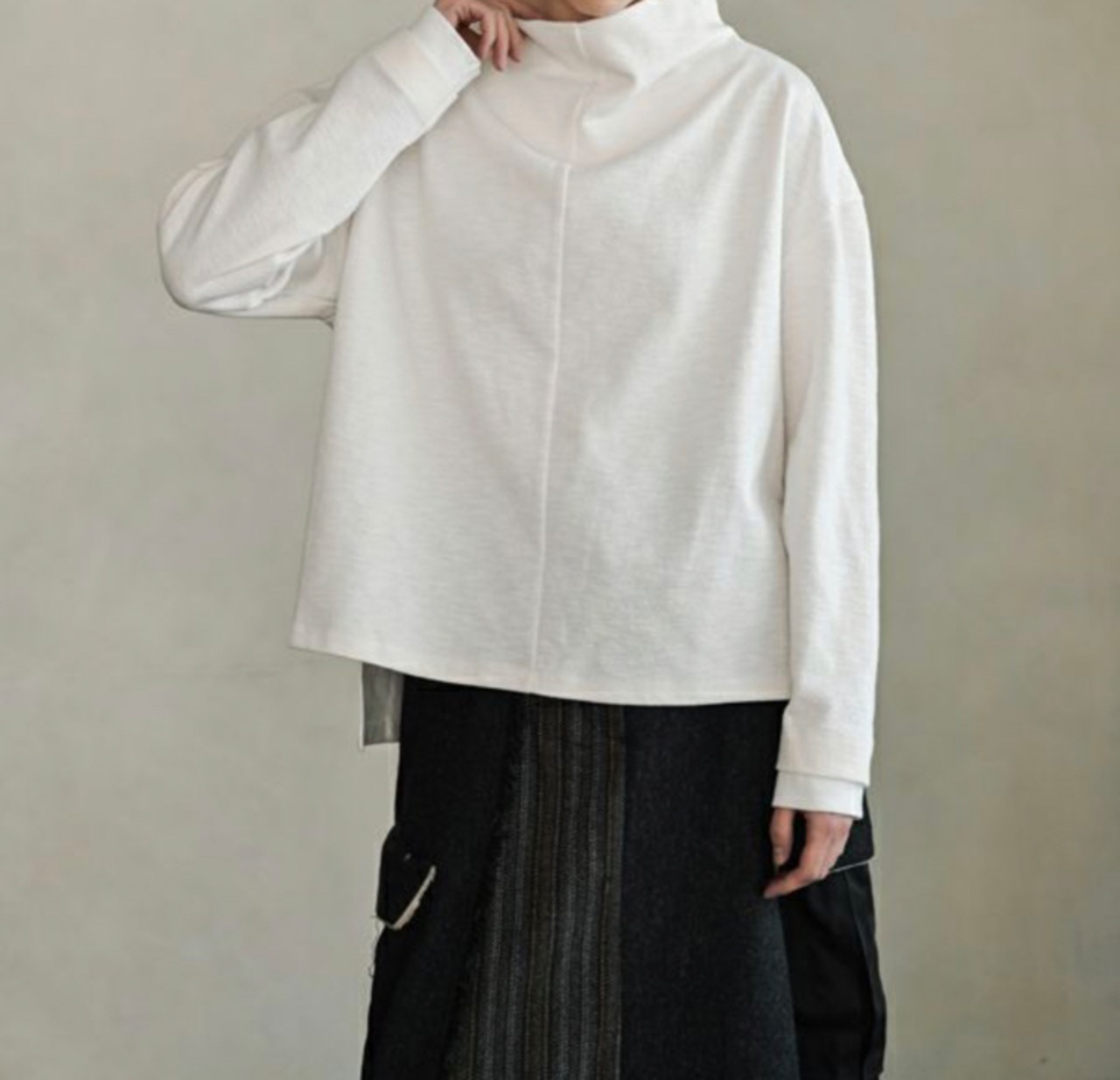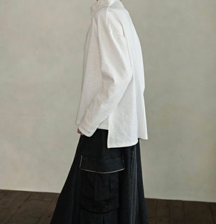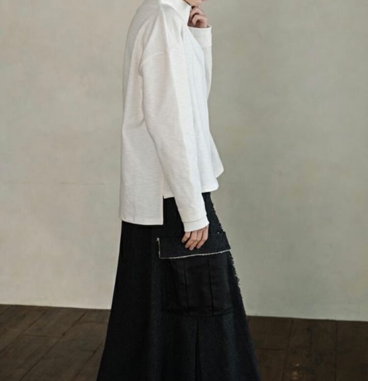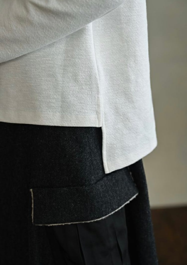裾には前後差とスリットを施し、前はウエストを、後ろはヒップを品よくカバー。