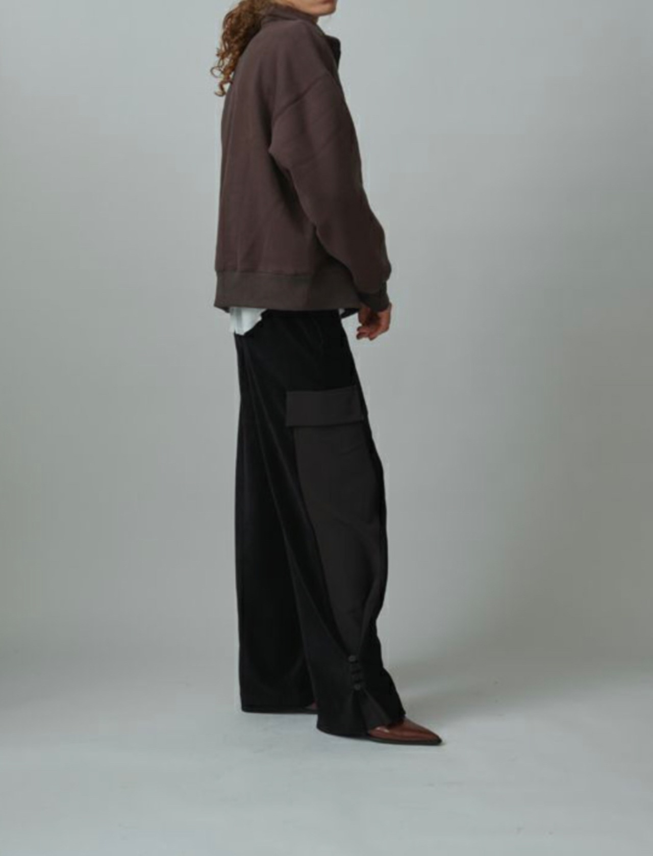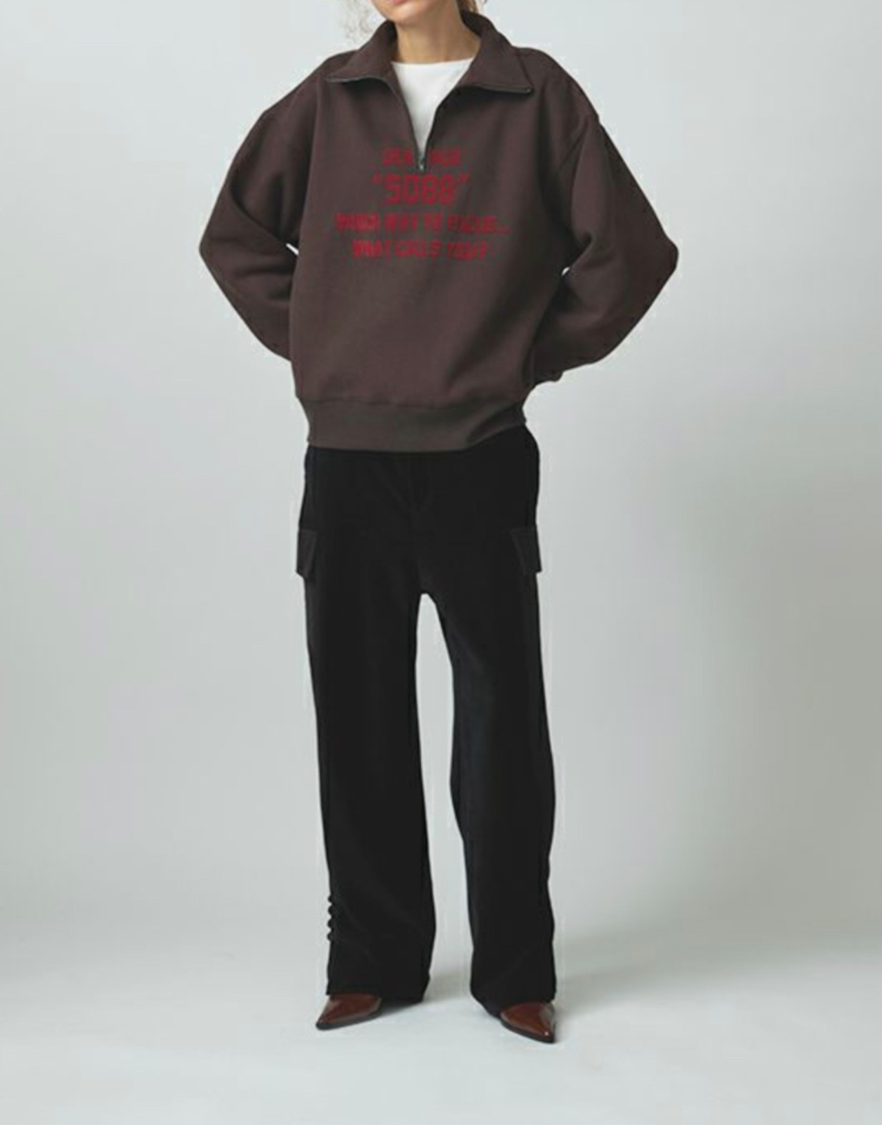 カジュアルな印象のハーフジップも、ウールのワイドパンツやセンタープレス入りのきれいめボトムと合わせることで、洗練されたミックススタイルに。