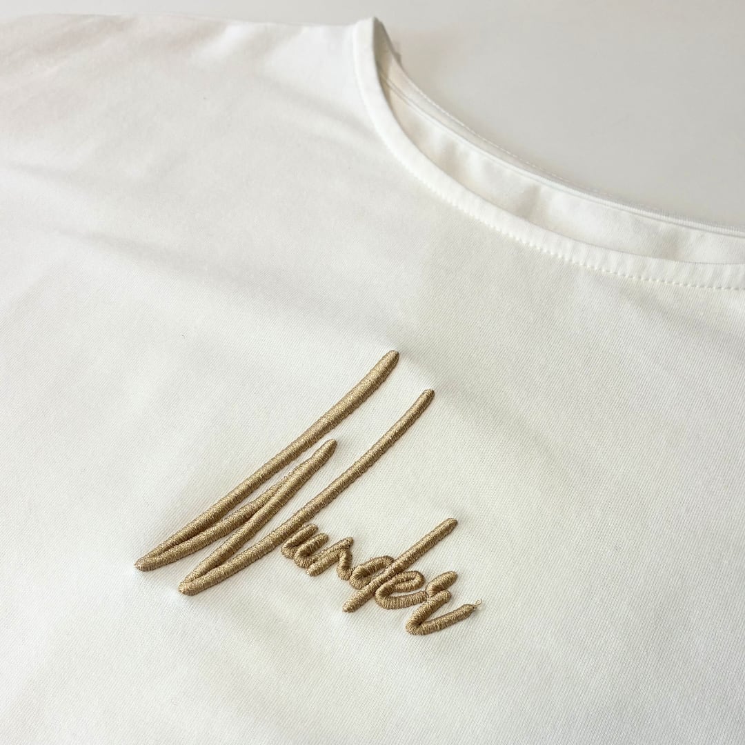 際立つ刺繍ロゴが魅力のレイヤードスタイル。