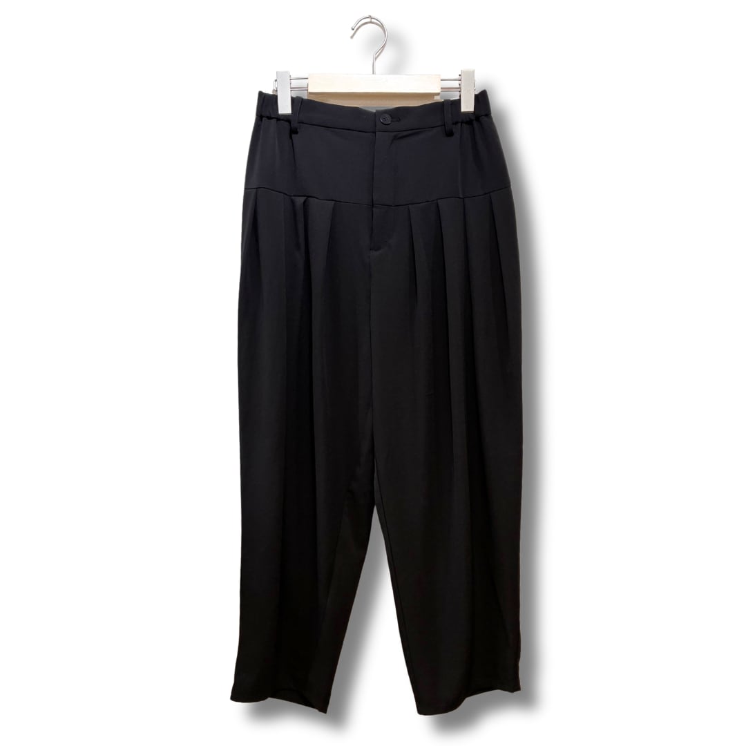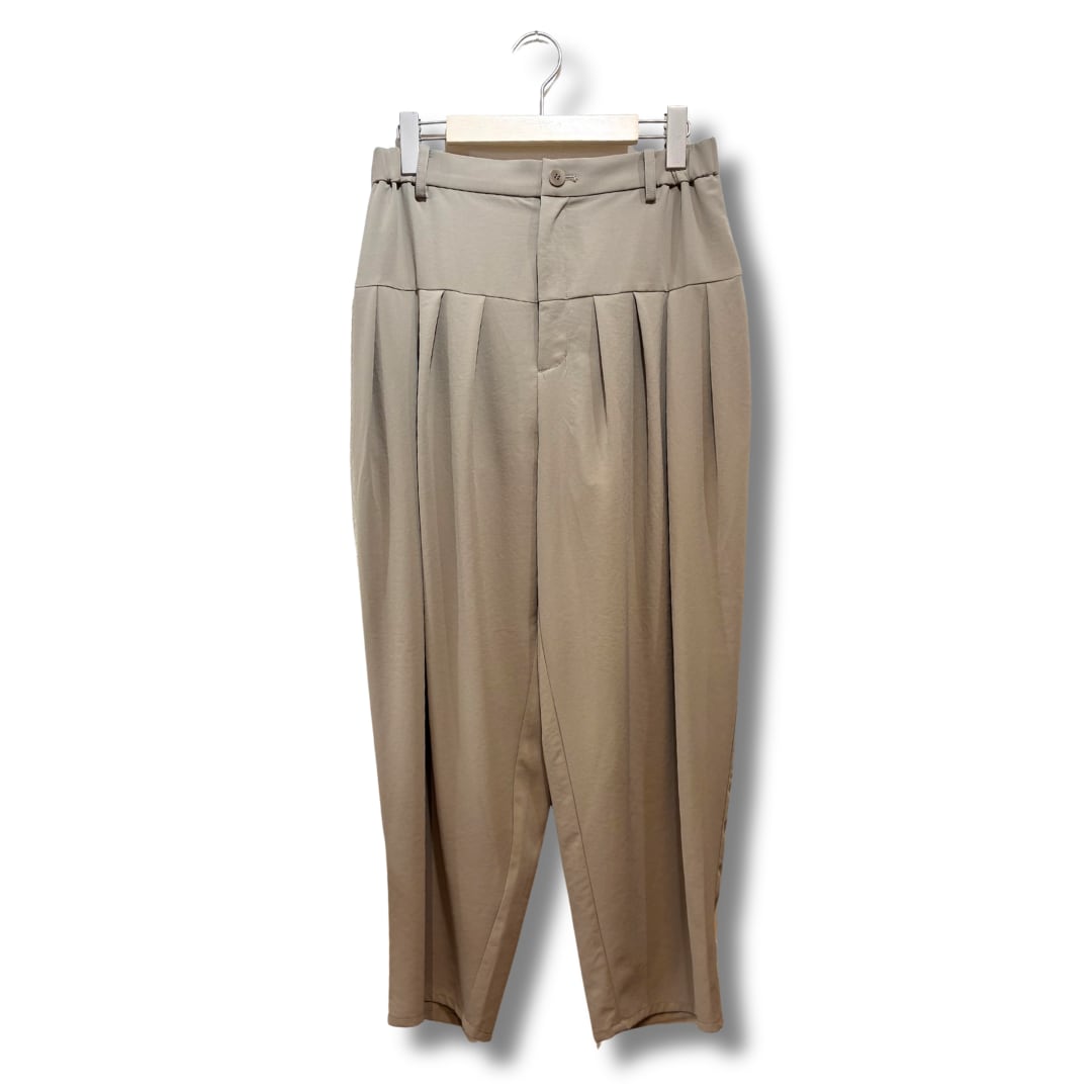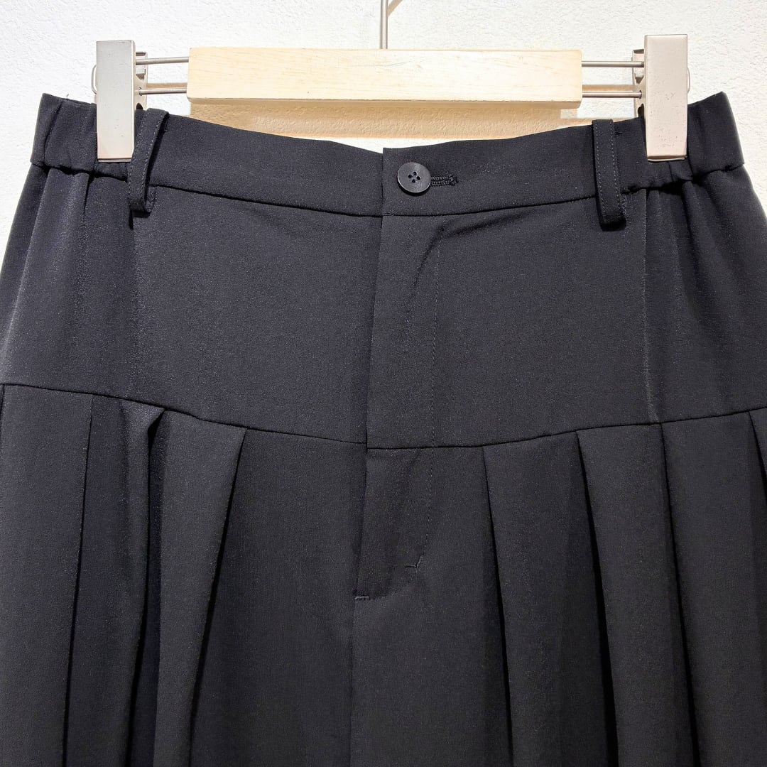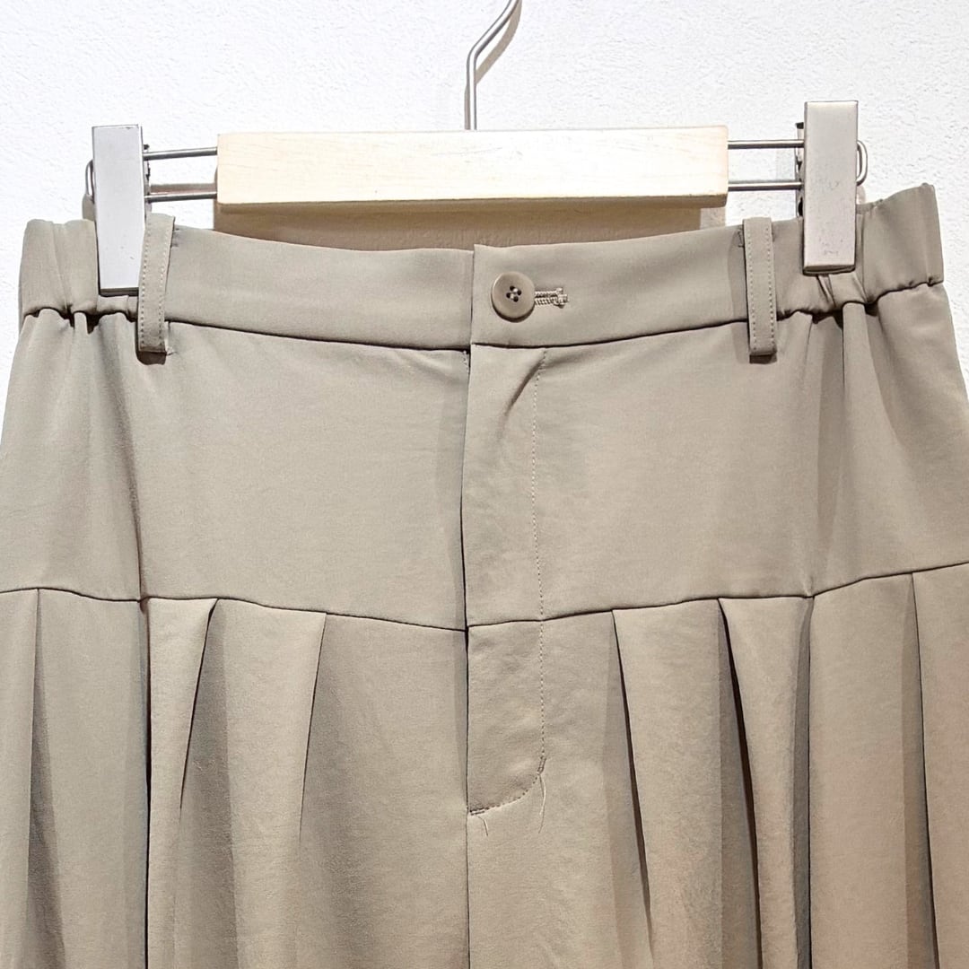 フロントはお腹周りをすっきりと仕上げ、切り替え下に配した多めのタックが腰まわりと太ももに立体感を生み出します。